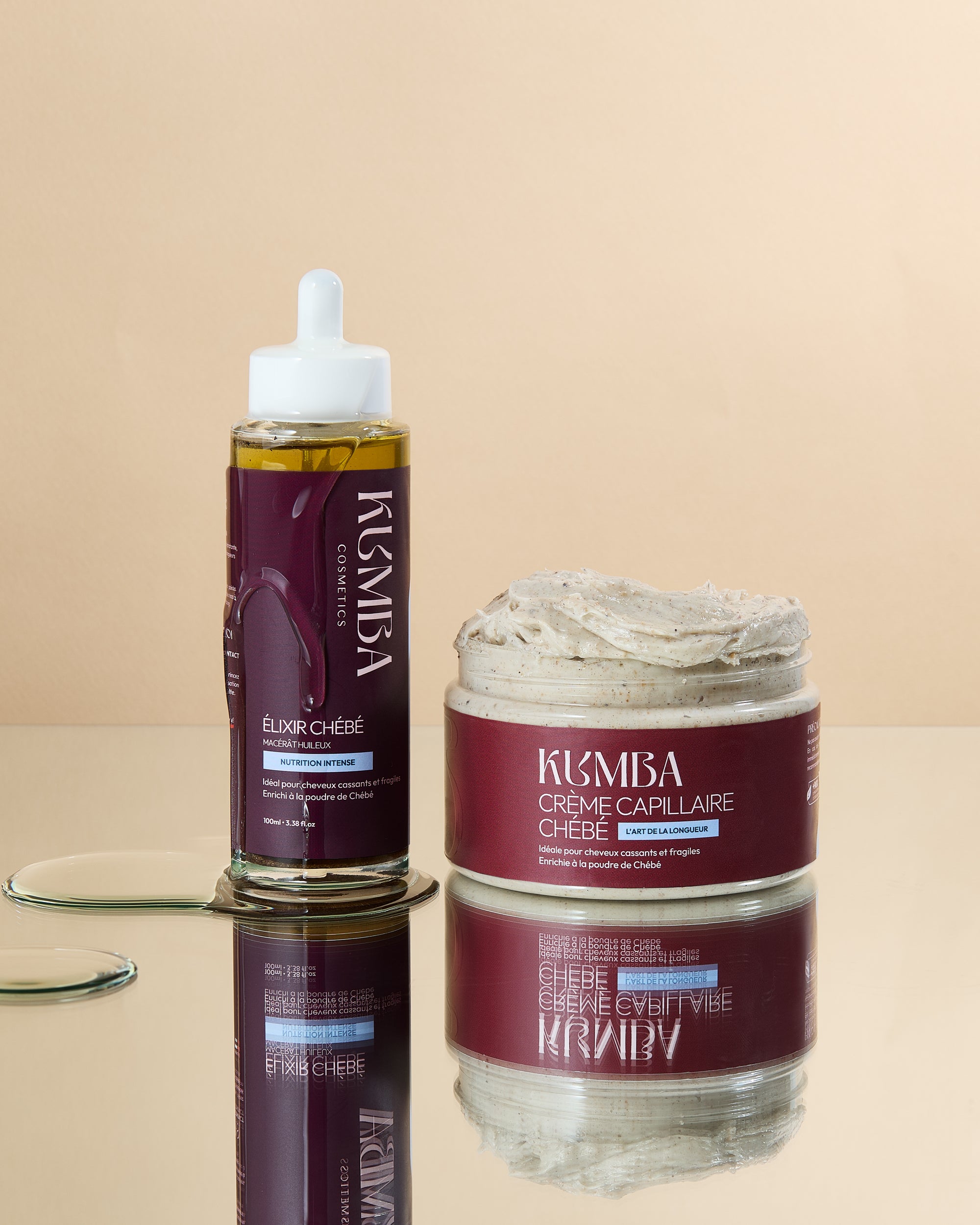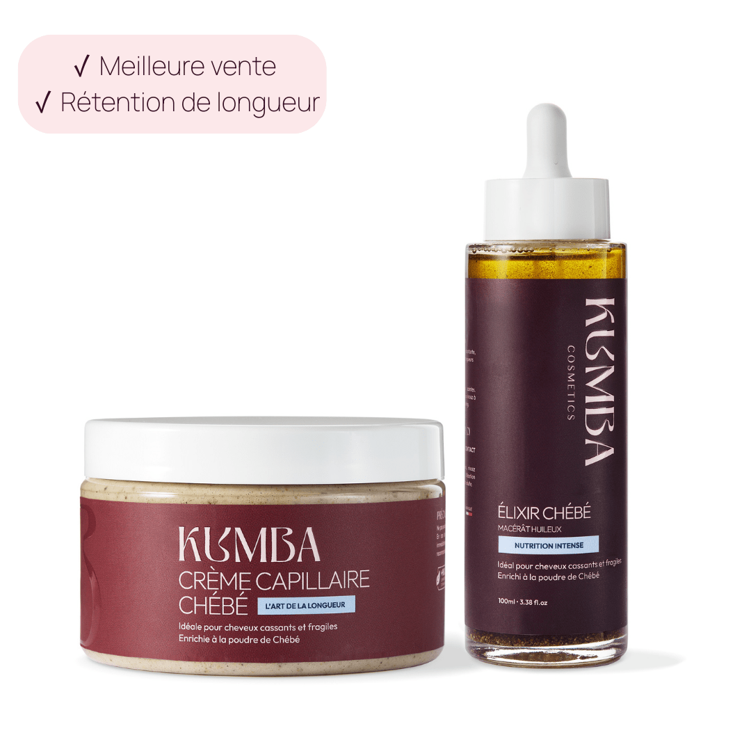 Le Duo Chébé Kumba est un rituel inspiré des traditions capillaires du Tchad, spécialement pensé pour fortifier les cheveux crépus fragiles et cassants. Il associe une crème riche et un élixir huileux infusé à la poudre de Chébé pour nourrir en profondeur, protéger la fibre et préserver chaque centimètre de longueur.
